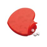 Cutie din plastic PP, în formă de inimă, cu dropsuri cu aromă de mentă . Conţine 8 grame de dropsuri .
