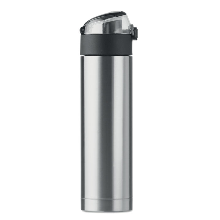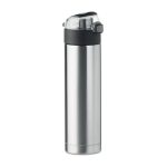 Sticlă de băut cu perete dublu din inox, cu închizător de siguranță pe capac și opțiune de deschidere prin apăsare. Are un suport pliabil pe vârf, pentru purtare ușoară. 400 ml. Anti scurgere. Fără scurgere.