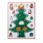 Brad de Crăciun din lemn cu 12 globuri asortate care se asamblează. Este împachetat într-o cutie de cadou cu un capac transparent.