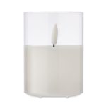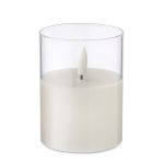 Lumânare de ceară cu LED-uri și efect de flacără reală în suport de sticlă. Funcționeaza cu 2 baterii AA care nu sunt incluse.